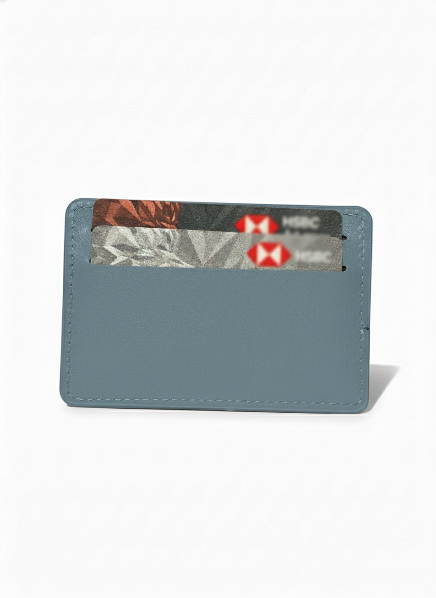 Elegant sky blue card holder with textured design and zip closure.